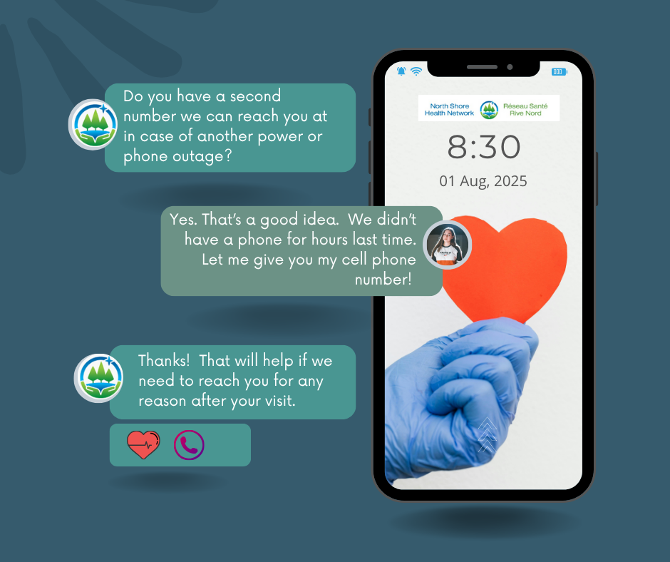 Image of text chat between NSHN and a patient following the recent telephone and power outages requesting a secondary contact number if available. This blitz will run throughout the month of August.